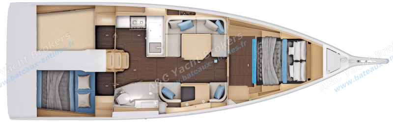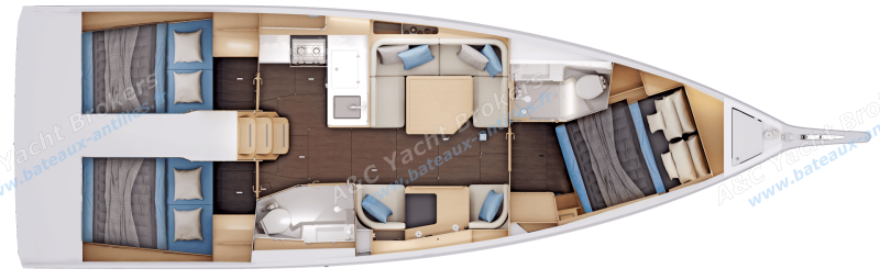 The interior layout features an L-shaped galley, located at the bottom of the companionway for better communication with the cockpit. The saloon is bright and functional, with plenty of storage space.