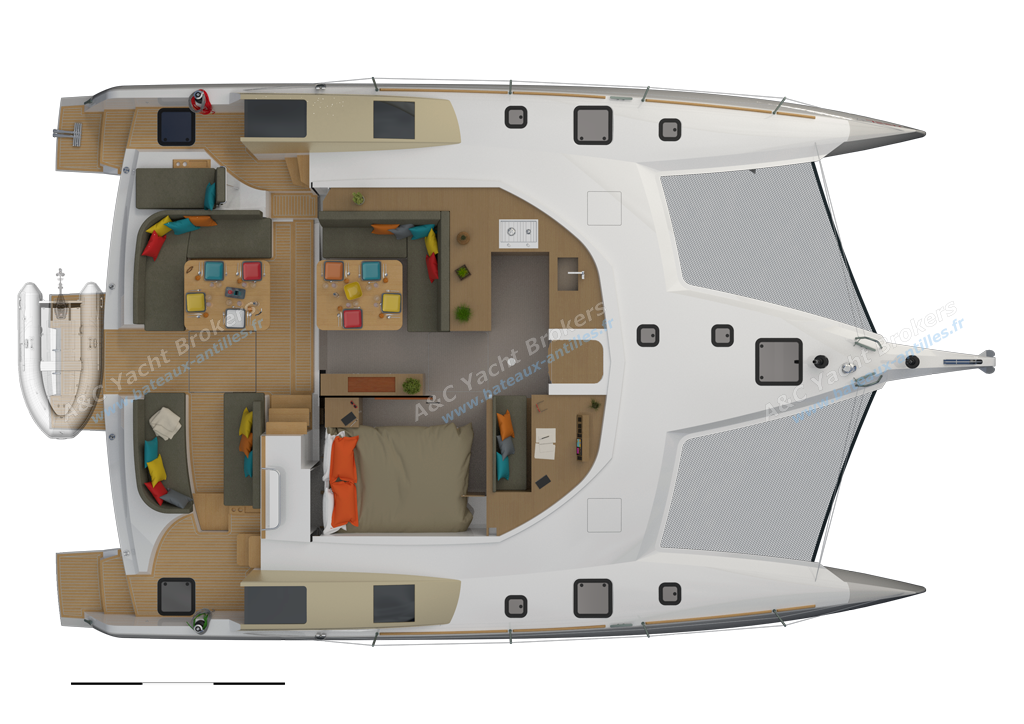Each float is equipped with an independent suite, offering comfort and privacy, with an individual shower room. In the extension, the forepeak can be fitted out, as an option, to optimise the accommodation capacity.