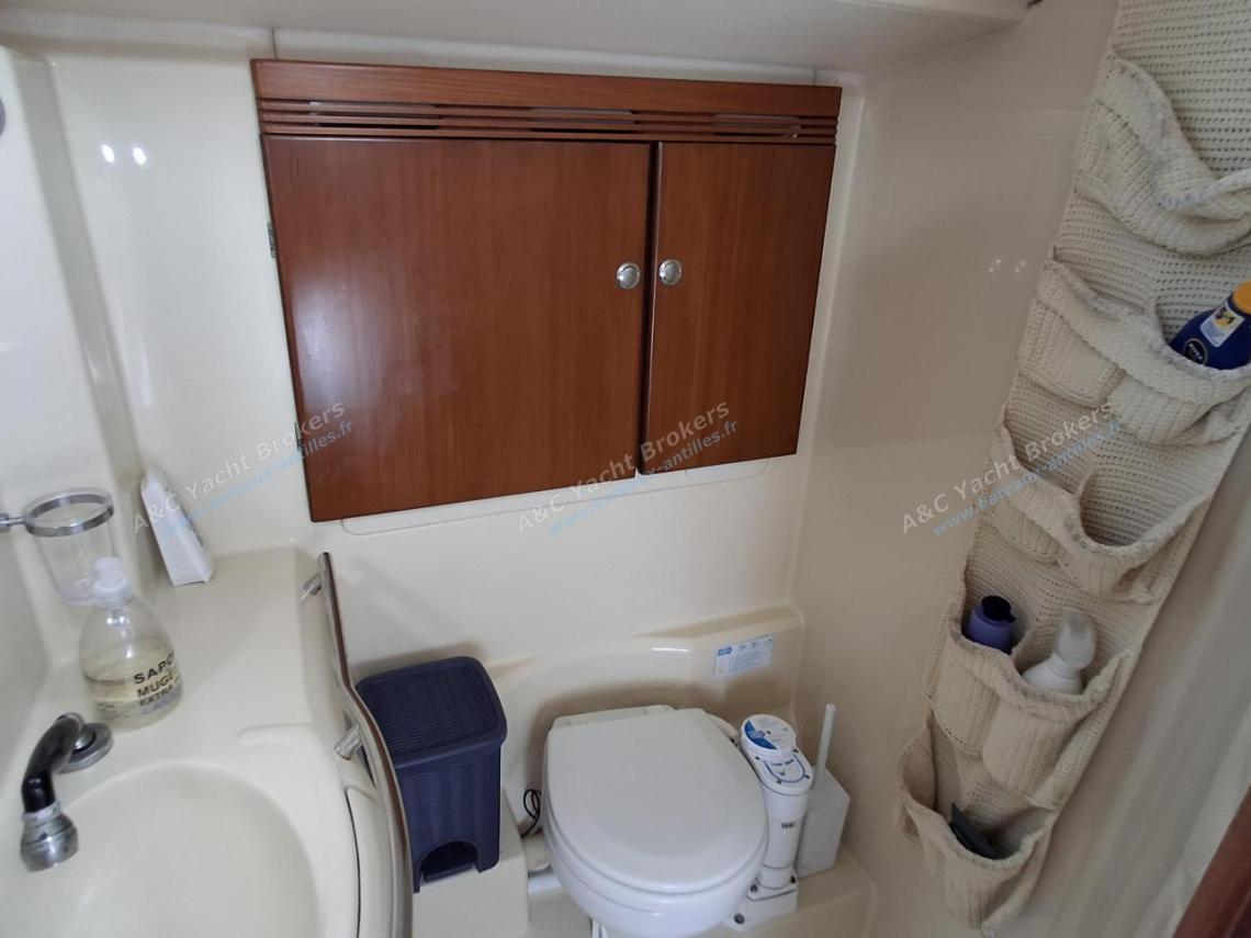 Une salle d’eau avec douche et lavabo et WC sur tribord avec un réservoir eau noire 60 L