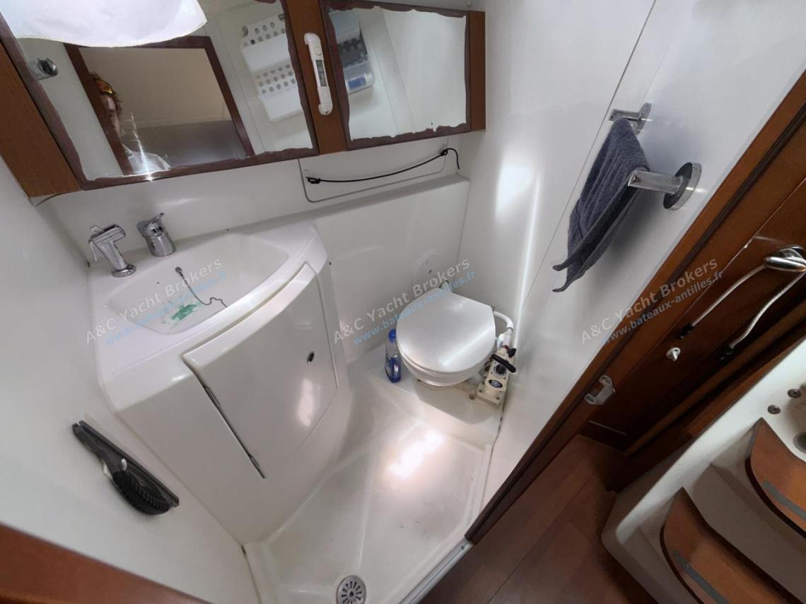 Une salles d’eau a l’arrière-tribord avec douche, lavabo et WC avec un holding-tank de 80 Litres