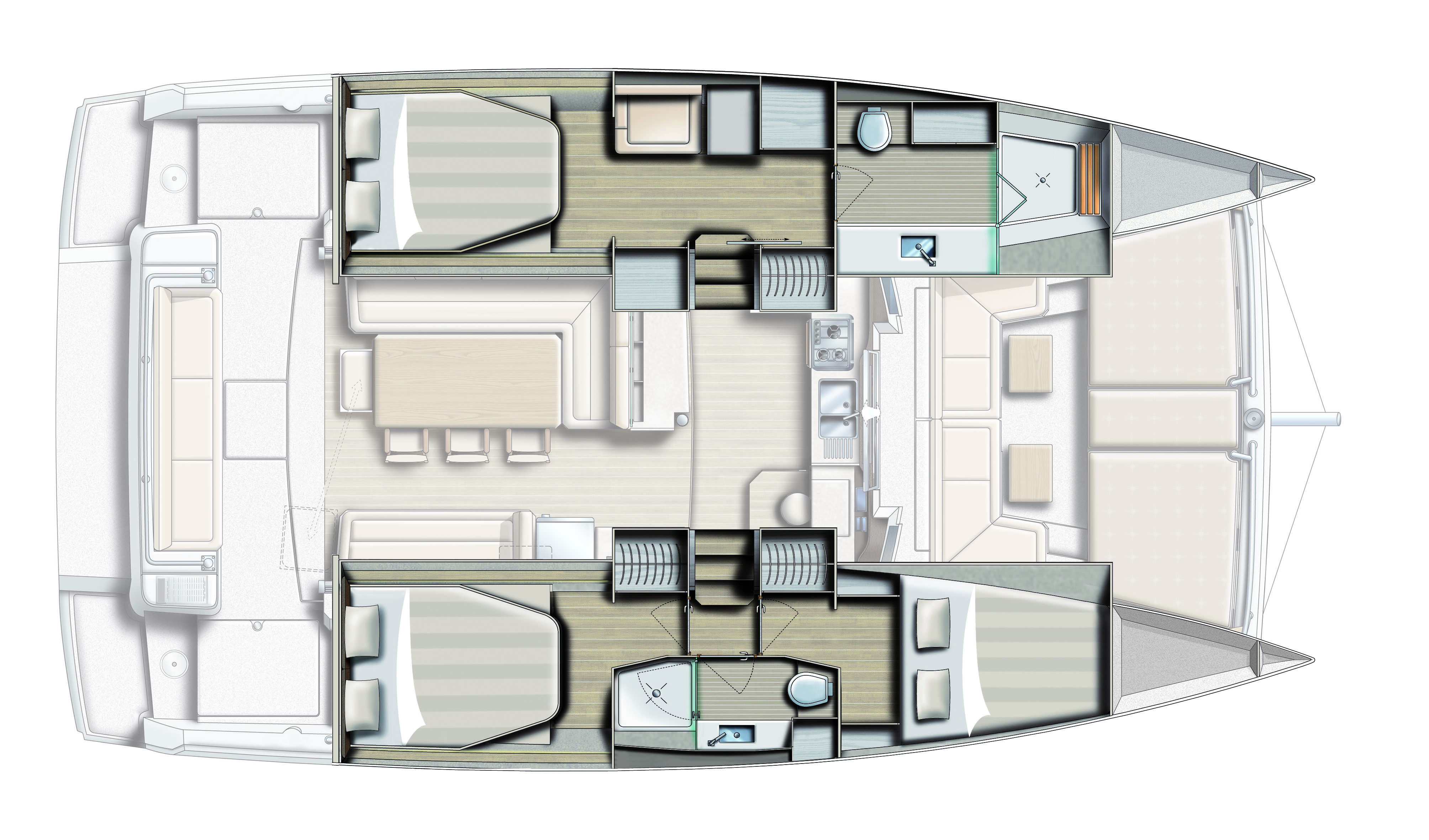 Open to the forward cockpit, with large countertop and galley / counter unit