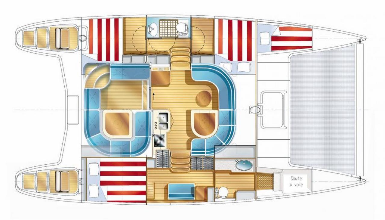 The slimline hulls and the double helm station that is situated at the rear of the cockpit combine together to make an efficient, pretty, comfortable and most agreable catamaran.