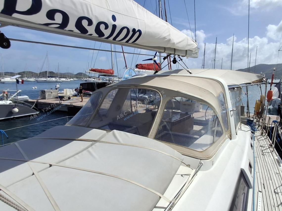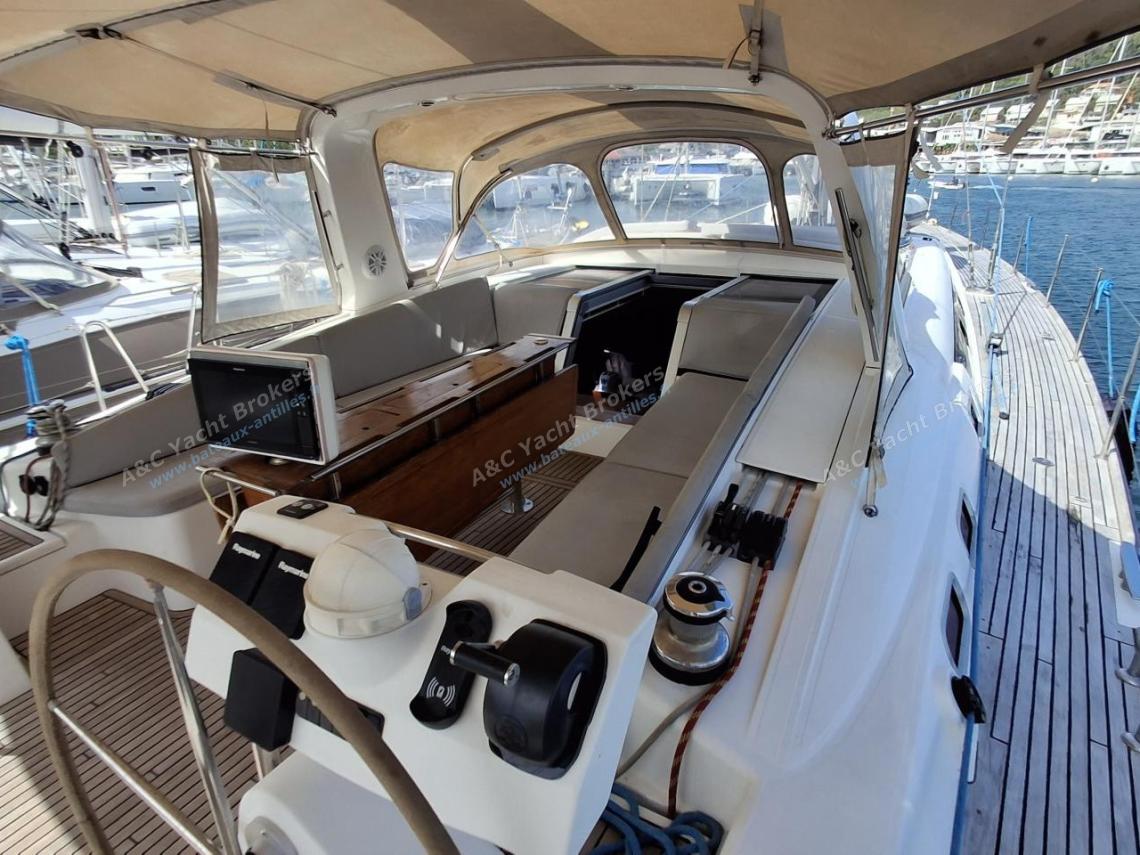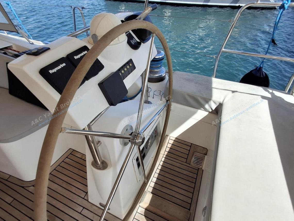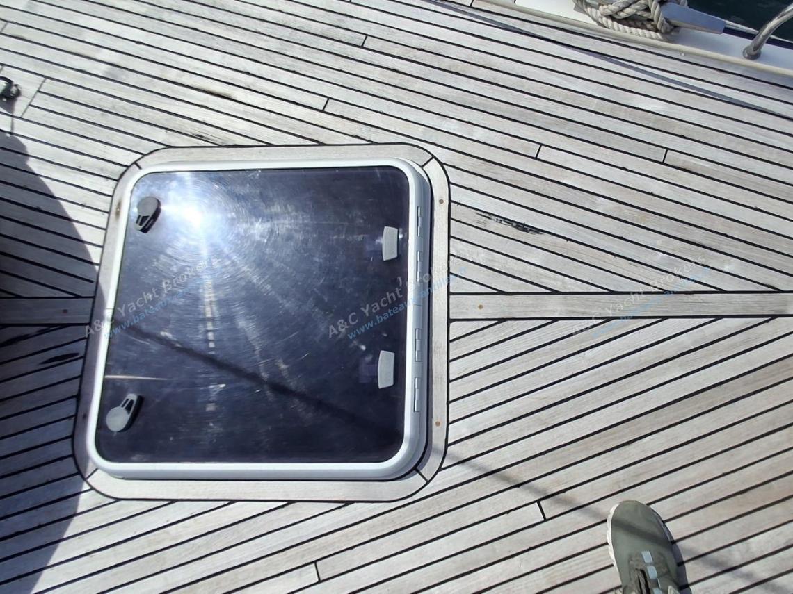 Teak flush deck decks and wide teak side decks, two helm stations with excellent visibility, spacious cockpit with comfortable benches and a large folding table.