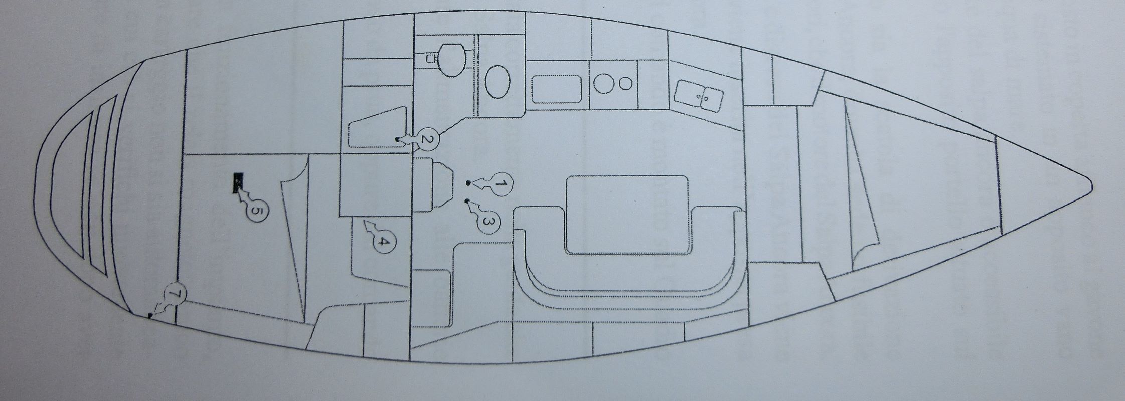 One aft port shower with shower, wash basin and marine toilet with holding tank.