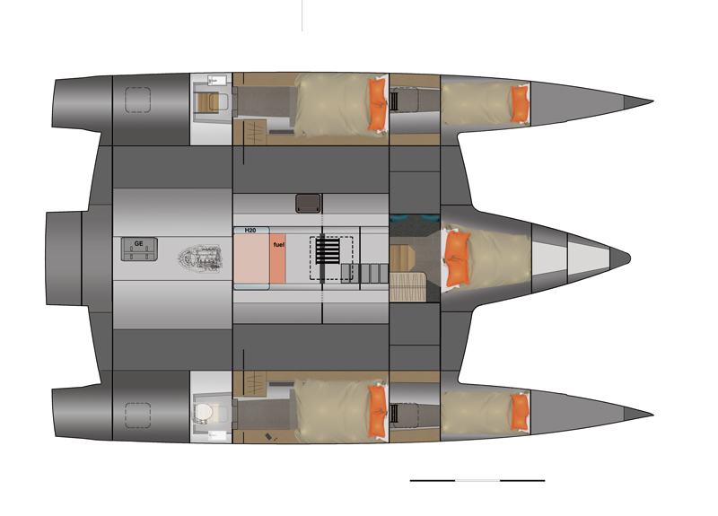 Two double cabins in the floats with washbasin, electric toilet with fresh water and shower.
